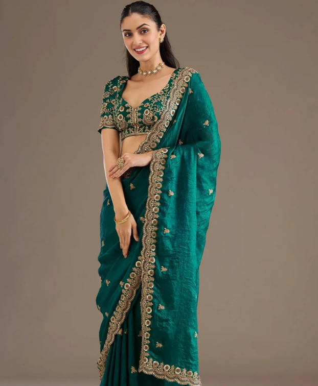 Designers are experimenting with subtle and bold patterns, ensuring these sarees cater to different preferences. Whether it is minimal sparkle or full embellishment, these outfits create a refined yet glamorous look that stands out in any setting.